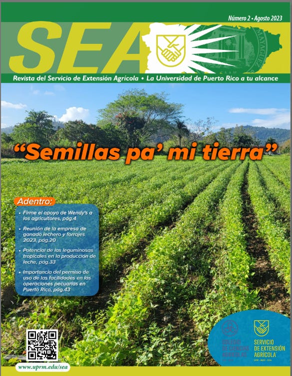 Esta semana se publicó el nuevo número de la Revista del Servicio de Extensión Agrícola. Si interesas continuar ese tema del ganado lechero, la revista incluye un resumen de la reunión de la empresa de ganado lechero y forrajes. Se discutieron allí los hallazgos de investigaciones recientes y también sobre oportunidades y retos para ese sector. Puedes ver la revista aquí.