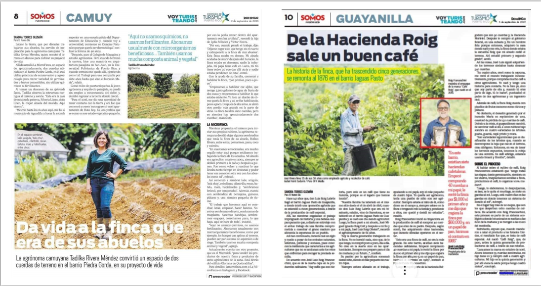 El Nuevo Día ha publicado varios perfiles agrícolas, proveyendo visibilidad a la gesta que usualmente no recibe la atención que merece. Estos perfiles han sido parte de la serie Somos, la cual tiene como objetivo realzar atributos turisticos, entre otros tantos, de nuestros municipios. Puedes ver el de Café Roig aquí, el de la Microfinca acá y en este otro enlace, el de Hábitat en Morovis. Estos diferentes perfiles pueden ser de utilidad en salones de clases.