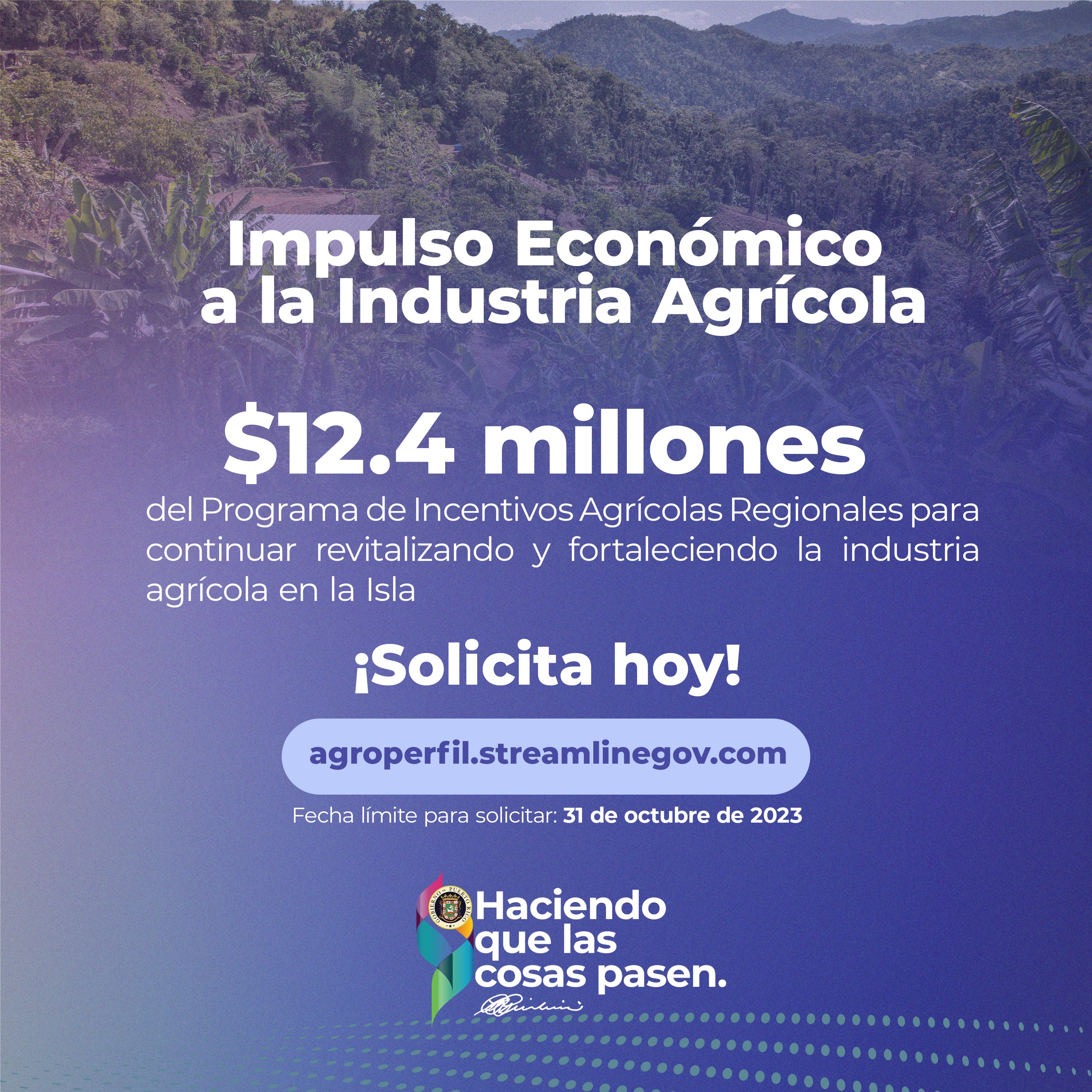 El Departamento de Agricultura anunció una serie de incentivos a través del Programa Regional de Agricultura. En este enlace puedes ver qué incluye cada uno. Las personas tienen hasta el 31 de octubre para solicitar, a través de su agroperfl. No son específicos en los requisitos de quién solicite (ej. si la persona debe ser Bona fide del DA). Los incentivos incluyen vales en efectivo, descuentos y materiales para: cacao, industria avícola, siembra y resiembra, tecnología agrícola, materiales agrícolas y de pesca, ganadería, apicultura, entre otros. Puedes llamar al 787-304-5350, para más información. El Nuevo Día hizo una nota.