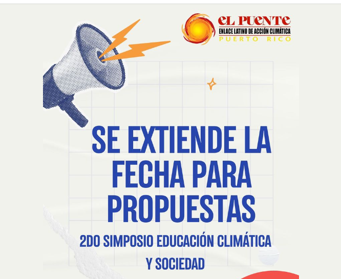 Se extendió para esta semana (23 de febrero) la oportunidad de someter propuestas para el 𝟐𝐝𝐨 𝐒𝐢𝐦𝐩𝐨𝐬𝐢𝐨 𝐝𝐞 𝐄𝐝𝐮𝐜𝐚𝐜𝐢𝐨́𝐧 𝐂𝐥𝐢𝐦𝐚́𝐭𝐢𝐜𝐚 𝐲 𝐒𝐨𝐜𝐢𝐞𝐝𝐚𝐝, a celebrarse del 17 al 19 de abril en la Facultad de Educación de la UPR de Río Piedras. “. El mismo tiene como propósito promover el diálogo alrededor de los temas de crisis climática y educación y estimular la búsqueda de soluciones que adelanten nuestra meta de construir una sociedad más equitativa y preparada ante el calentamiento global”. En este enlace puedes acceder info del evento y también las instrucciones para someter propuestas.