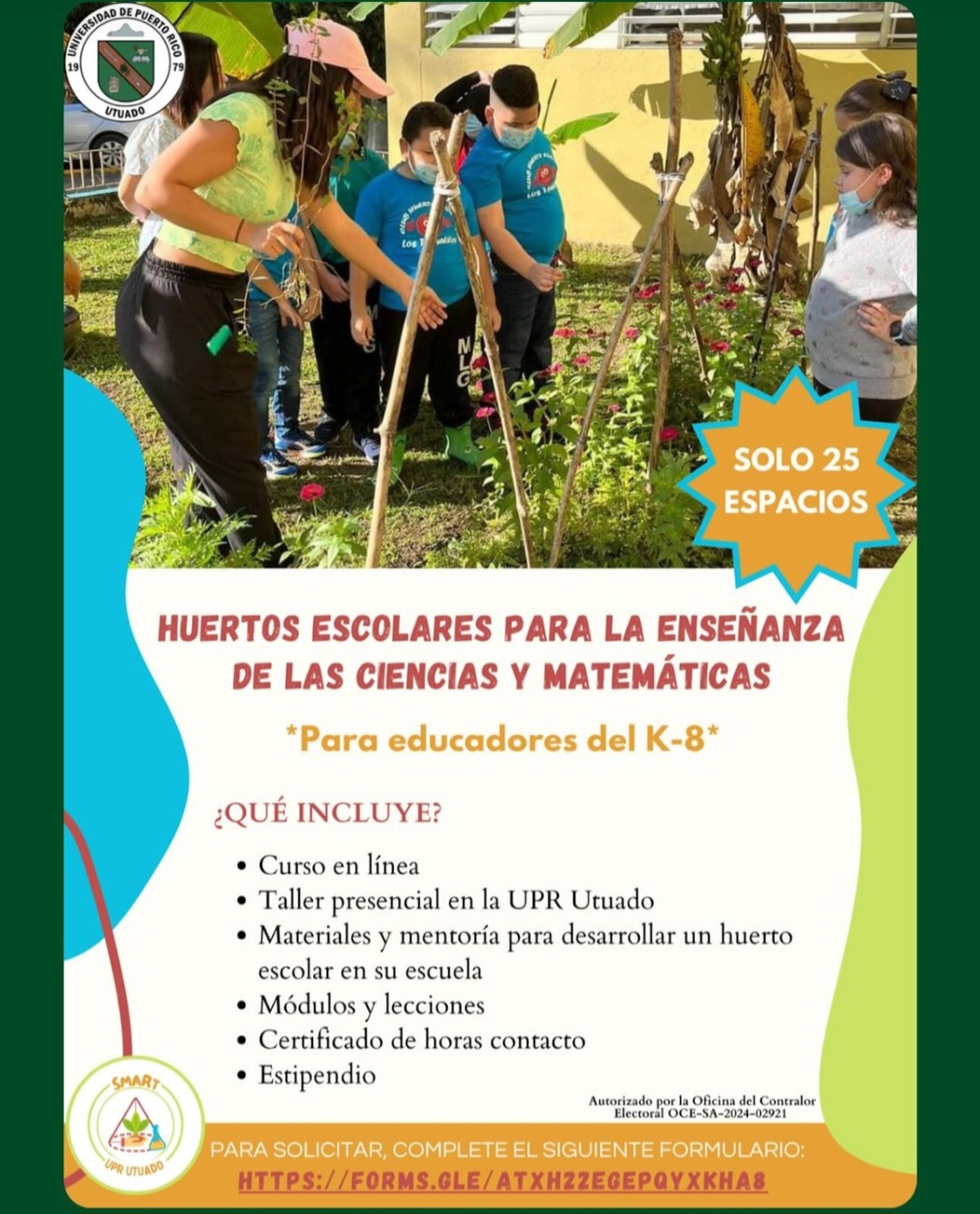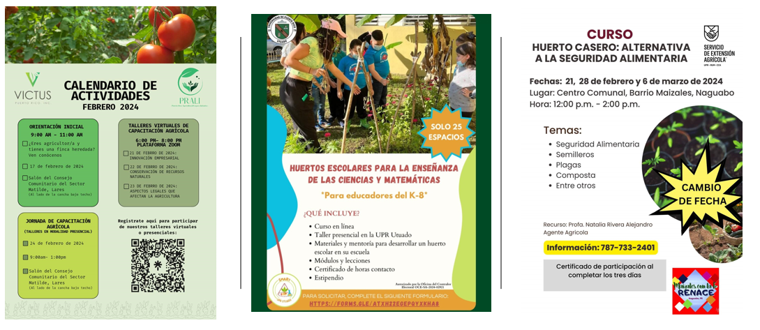 ¿Das clase de K-8? La UPR Utuado estará llevando a cabo talleres dirigidos a docentes que quieran iontegrar temas agrícolas en sus clases y establecer un huerto en su escuela. El curso se titula: Recursos educativos para integrar huertos escolares en cursos de ciencias y matemáticas. El curso está limitado para 25 personas y se les proveerá un estipendio de $1,500. Conoce más y solicita aquí.