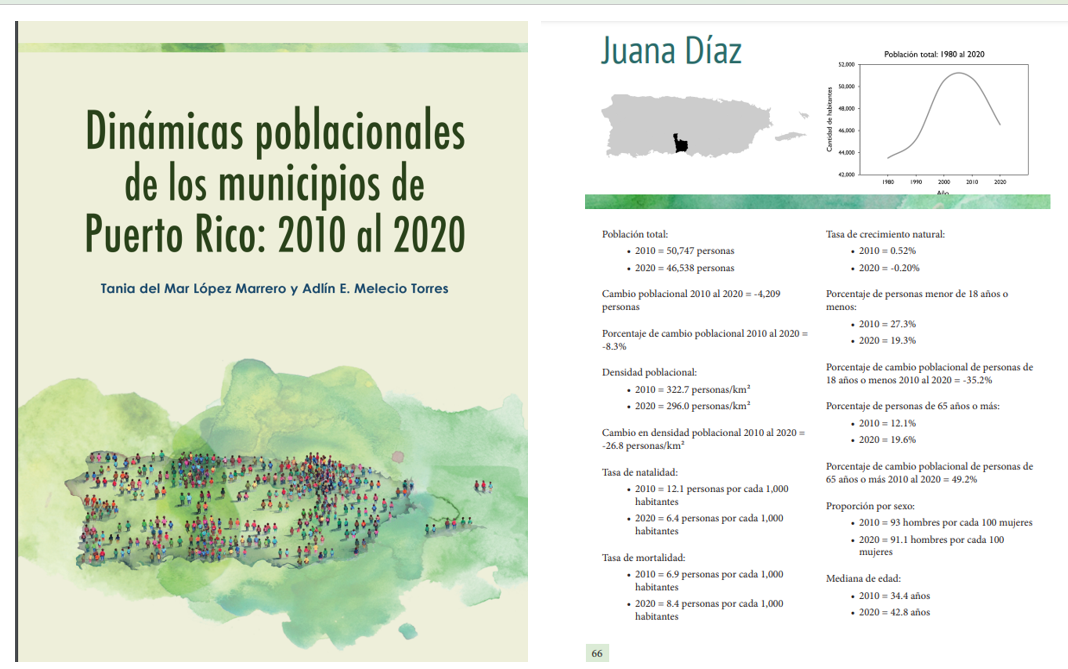 La profesora Tania López Marrero de la UPRM compartió la nueva publicación, “Dinámicas poblacionales de los municipios de Puerto Rico: 2010-2020, la cual, a través de mapas y perfiles municipales, presenta diferentes datos poblacionales y de estadísticas vitales a nivel municipal durante la pasada década. El trabajo surge a partir de la colaboración entre el Centro Interdisciplinario de Estudios del Litoral y el programa Sea Grant, ambos de la Universidad de Puerto Rico-Recinto de Mayagüez. Actualiza información poblacional de décadas anteriores y publicada en dos trabajos previos”. Accédela aquí.