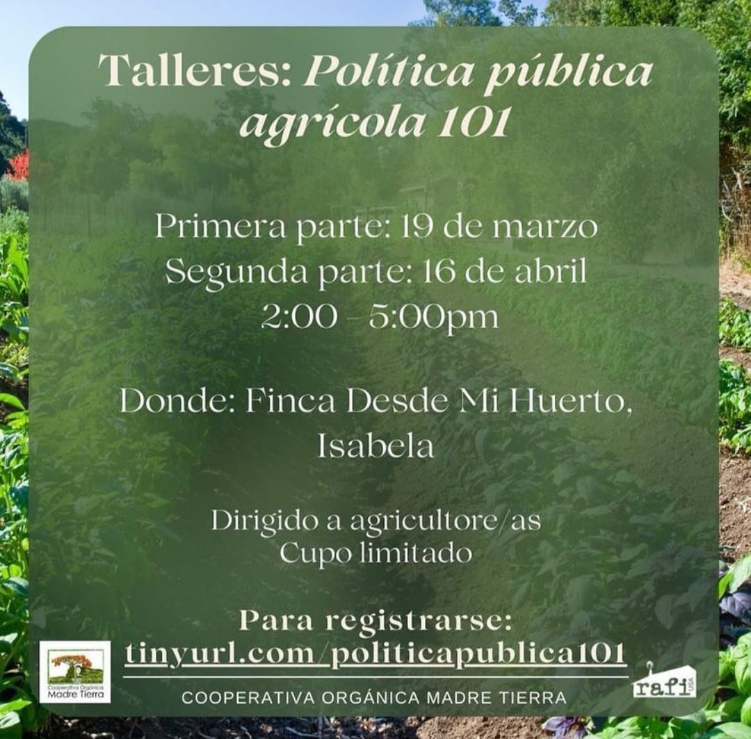 Estos talleres van dirigidos a agricultores agroecológicos interesades en incidir en procesos de política pública para mejorar las condiciones de la agroecología en Puerto Rico.