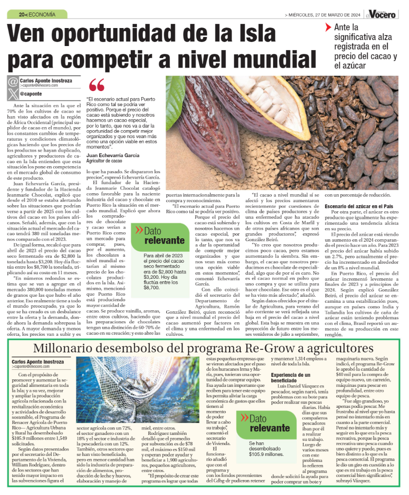 Dos notas en El Vocero, relevantes para el sector agrícola: una sobre el el precio del cacao y otra sobre el desembolso millonario del programa ReGrow, el cual ha sido ampliamente criticado.