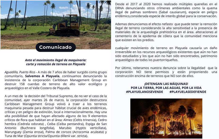 Abajo comparto un comunicado emitido por la iniciativa comunitaria, Salvemos a Playuela. Aquí puedes conocer más sobre lo que está sucediendo allí. Desde el 2021 se está exigiendo vistas públicas sobre la RS 163, la cual “investiga el proyecto propuesto en Playuela, evalúa los daños que podría causar y por primera vez encamina la propuesta de la comunidad para otorgar un grado de conservación a este valioso ecosistema.” Si quieres, apoyar, entra a su página y oprime el botón que envía un email automático a la legislatura.