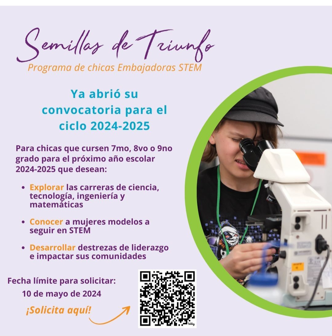 Abre nueva convocatoria para el Programa Semillas de Triunfo de Ciencia Puerto Rico. “En el ciclo de 2024-2025, Semillas de Triunfo busca inspirar a 120 niñas de los grados 7mo, 8vo y 9no de escuelas públicas y privadas de Puerto Rico y «Homeschoolers» para tener acceso a mujeres modelos a seguir, explorar carreras en STEM y desarrollar sus destrezas de liderazgo”. El programa gratis incorpora ciencias agrícolas y ambientales. Conoce más y solicita aquí. Comparte la info.