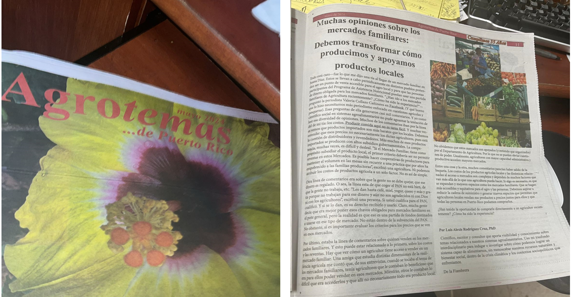 Estoy muy agradecido con Luis Curbelo Rodríguez, director y editor de Agrotemas, medio que lleva circulando 35 años y siendo leído por el agro local. La edición de mayo incluyó un ensayo que escribí sobre los mercados familiares. Esto fue gracias a una recomendación que hizo Mildred Cortés. Me entusiasma mucho aportar a Agrotemas.