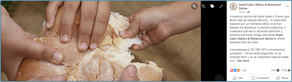 Fue desde el teléfono de La Borinqueña que mami me llamó tres semanas después de María. Era de los pocos lugares en el área con planta eléctrica y teléfono de línea. Las panaderías, más allá de ser lugares para buscar dulzura y gozo, son espacios multifuncionales que son parte de un ecosistema que nos permiten compartir y acceder recursos. Y como me dijo mi amiga Jenny Meletiche Gastón hace unos días: lugares que hemos permitido que pasen desapercibidos, que no les rendimos el valor que merecen, particularmente a sus confecciones que tachamos de comunes–la cotidianidad tiene su belleza. Nuestras panaderías merecen una oda; merecen que las posicionemos como elementos importantes de nuestra gastronomía y que sean reconocidas como lugares que aportan al manejo de emergencias.