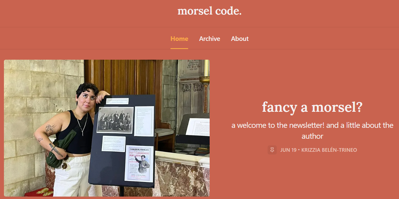 comida y cultura: Hace poco, mi colega Krizzia Belén-Trineo, investigadora interdisciplinaria, comenzó su newsletter morsel code. Aquí Krizzia escribe sobre temas agroalimentarios, cultura y el ambiente. Considera suscribirte y compartirla—cabe destacar que es contenido en inglés.