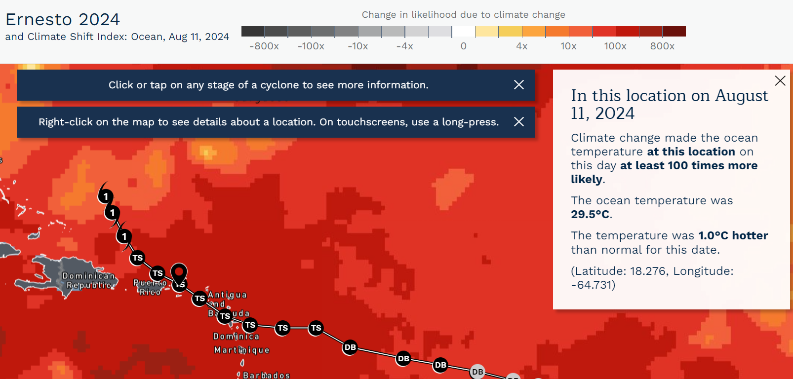 Según el Servicio Nacional de Meteorología, se reportaron sobre 6 pulgadas de lluvias en distintos lugares. El área por Orocovis recibió alrededor de 10 pulgadas. Climate Central reporta que las aguas del Caribe estabán más calientes de lo normal, lo cual contribuyó a la formación de Ernesto.