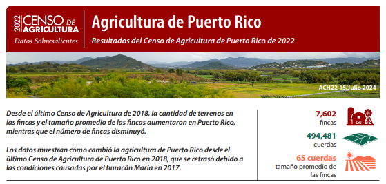 “USDA publica el Censo de Agricultura de Puerto Rico 2022”, reportó el Servicio Nacional de Estadísticas Agrícolas. “De manera similar a las tendencias agrícolas en los Estados Unidos continentales, el tamaño promedio de las fincas aumentó a partir de 2018 (59.3 cuerdas en 2018 a 65.0 cuerdas en 2022), mientras que el número de fincas disminuyó a 7,602 fincas, una pérdida de 628 fincas desde 2018. Si bien el número de fincas disminuyó, la cantidad de terreno cultivable aumentó a 494,481 cuerdas, o 21.9% de todo el terreno en Puerto Rico. Esto supuso un aumento de 6,706 cuerdas (1.4%) con respecto a 2018.”