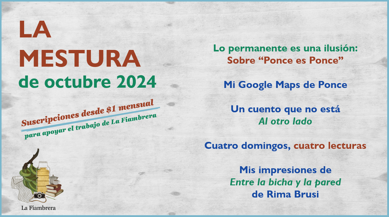 Hoy cociné La Mestura de octubre para las personas con suscripciones pagas. El ensayo que trae es un crónica sobre correr bicileta por el maltratado paseo lineal de Ponce. Reflexiono sobre un futuro posible para nuestra ciudad y sobre la ilusión que es lo permanente. La Fiambrera de hoy trae, además, 14 anuncios para esta semana y 5 noticias recién publicadas. También comparto el documental de una querida amiga, sobre volver a casa. Lo presentamos esta semana. Y la Noticia chévere sabe a ñame local.