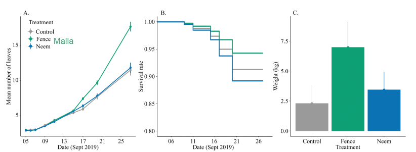 Diseñaron un experimento con varios predios intercalados de lechuga y pepinos en Gurabo y Juana Díaz, sumando 0.25 cuerdas en cada lugar. Algunos estaban expuestos (grupo control), otros estaban cercados con la malla de 5.6 pies de altura y algo enterrada, como recomendó la agricultora, y la otra estrategia empleada en algunos predios fue el aceite de Neem orgánico (grupo experimental), el cual está recomendado en el plan del DRNA. Se documentaron 289 iguanas en seis días en Juana Díaz y once en cinco días en Gurabo, por lo que utilizaron los datos de Juana Díaz para el análisis estadístico. Solo se concentraron en los datos de cultivos de pepinos afectados; “me sorprendió que no se comieran la lechuga”, comentó la investigadora, quien también enfatizó sobre cómo las iguanas pudieran tener preferencias por unos cultivos sobre otros cuando varios están presentes.