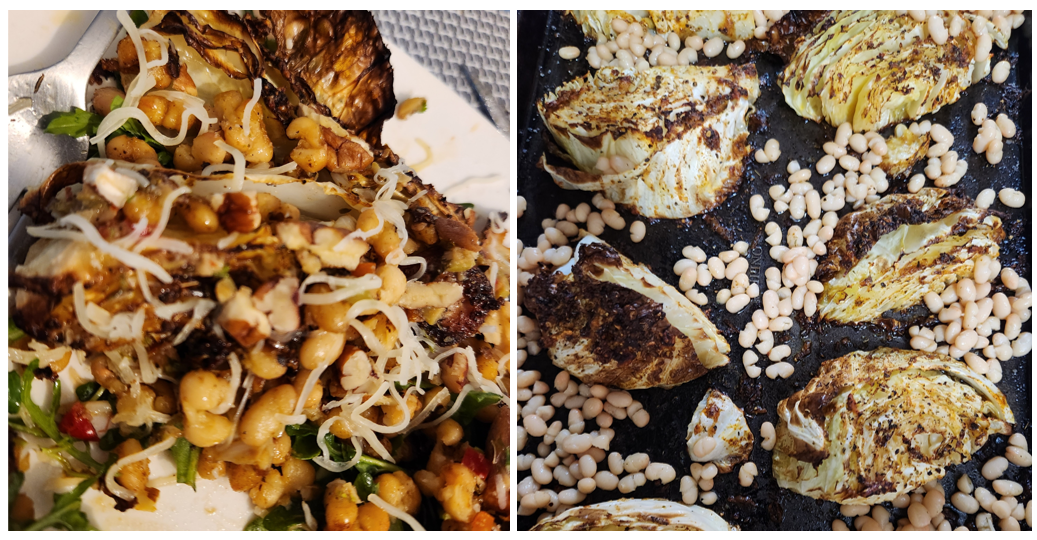 Esa es mi ensalada de siempre. Lo que haya, encima de lo que haya. A veces es solo tomate y cebolla. En otras ocasiones es solo lechuga verde esperanza del país. Pasa también que uno se siente con más tiempo o tiene más vegetales y hace algo distinto, como rodajas de repollo horneado.